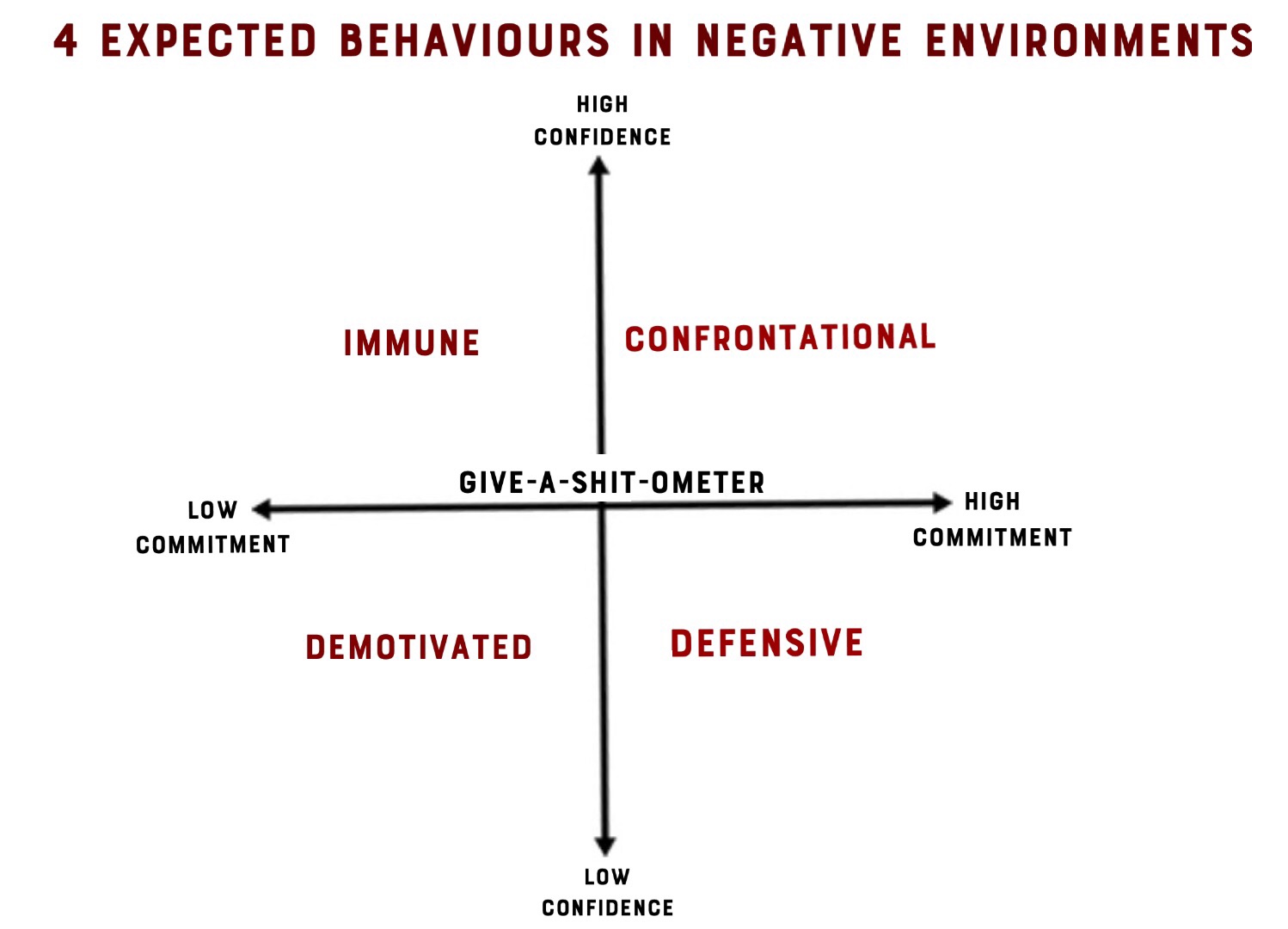 - Here are the 4 behaviours – Demotivated, Defensive, Confrontational and Immune