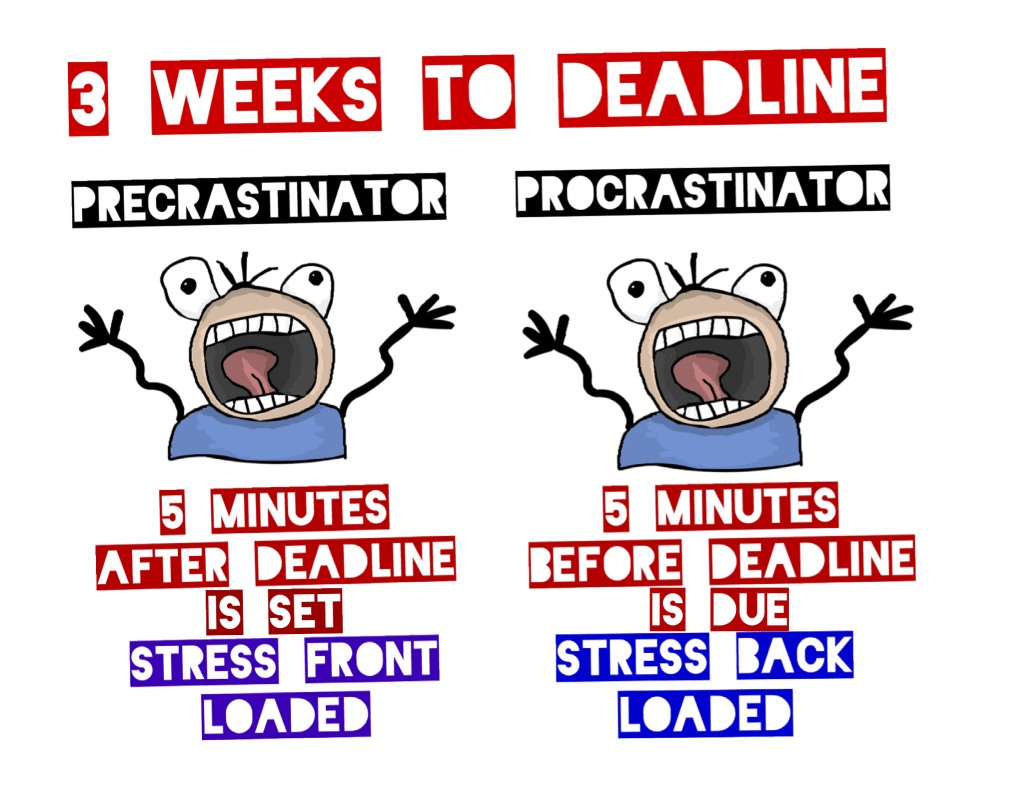 The term PREcrastinator is much less known. It’s basically someone who feels the same level of panic as the Procrastinator, just it’s 5 minutes after the deadline is set as oppose to 5 minutes before the deadline is due.