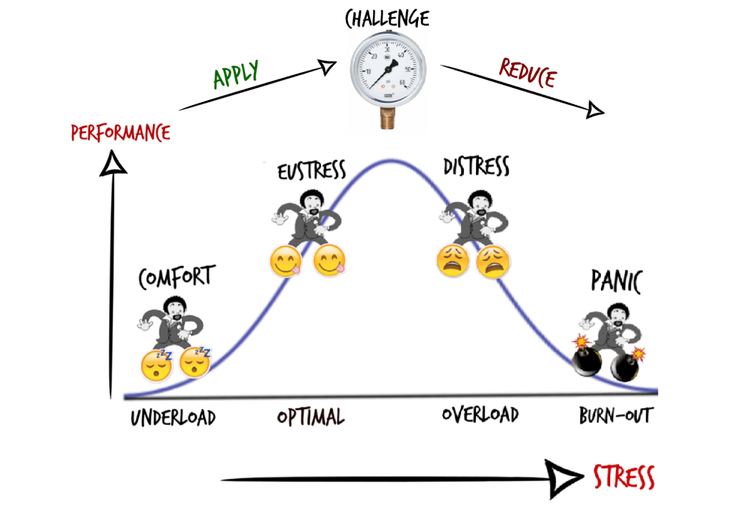 If in underload, Apply Challenge, if in overload or panic Reduce Challenge.The secret is to spend as much time in eustress as you can.