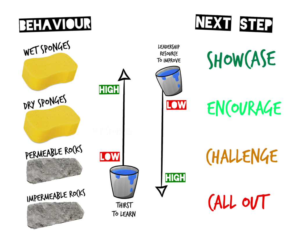 - Wet Sponges. These are team members that are constantly looking for new ideas and knowledge to support their growth and build capability. They show initiative and require low supervision. The relevant next step is to showcase them encouraging others to model their desired behaviour